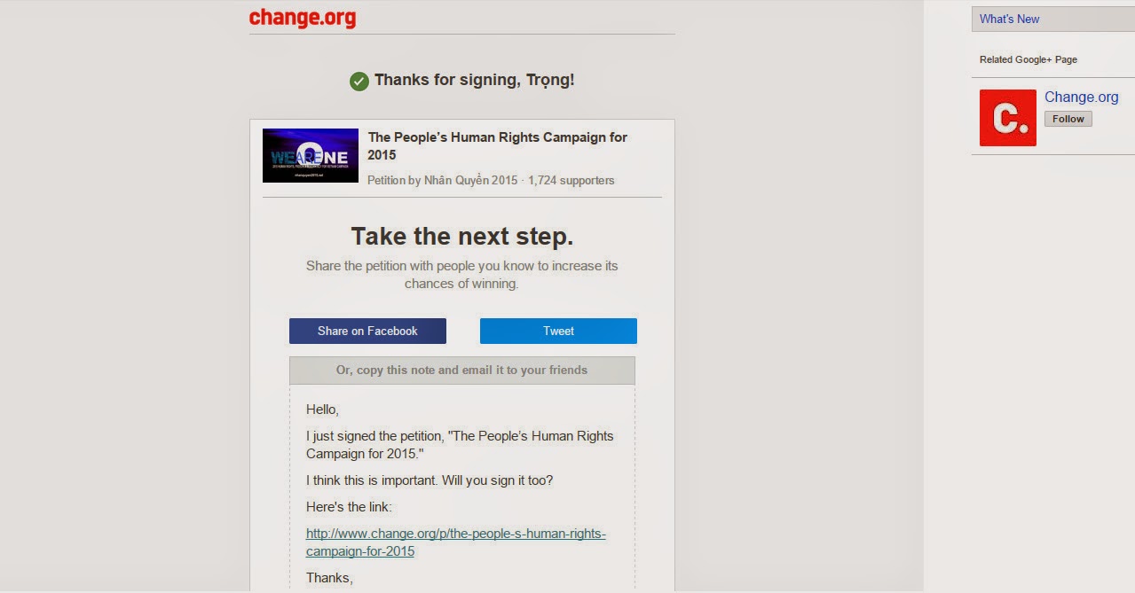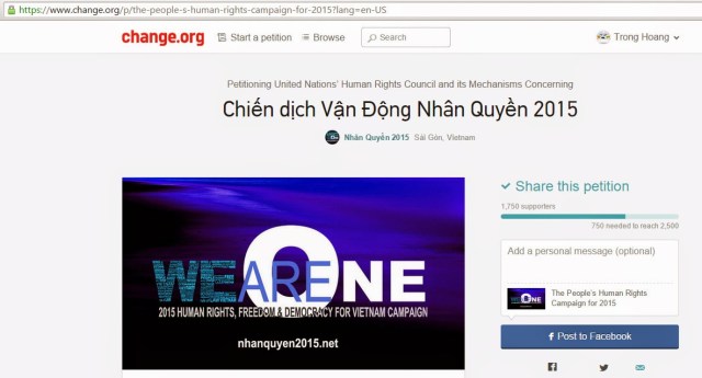 Sau đó, bạn sẽ quay trở lại trang web ký tên Chiến dịch Vận Động Nhân Quyền 2015. Lúc này, phần khung bên phải sẽ hiện ra giòng chữ “Share this petition” màu xanh, phía góc phải trên cùng ghi lại họ tên mà bạn vừa nhập vào.