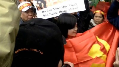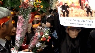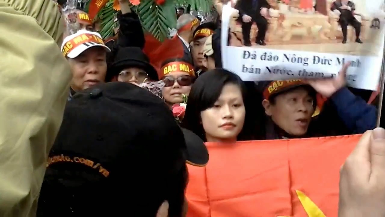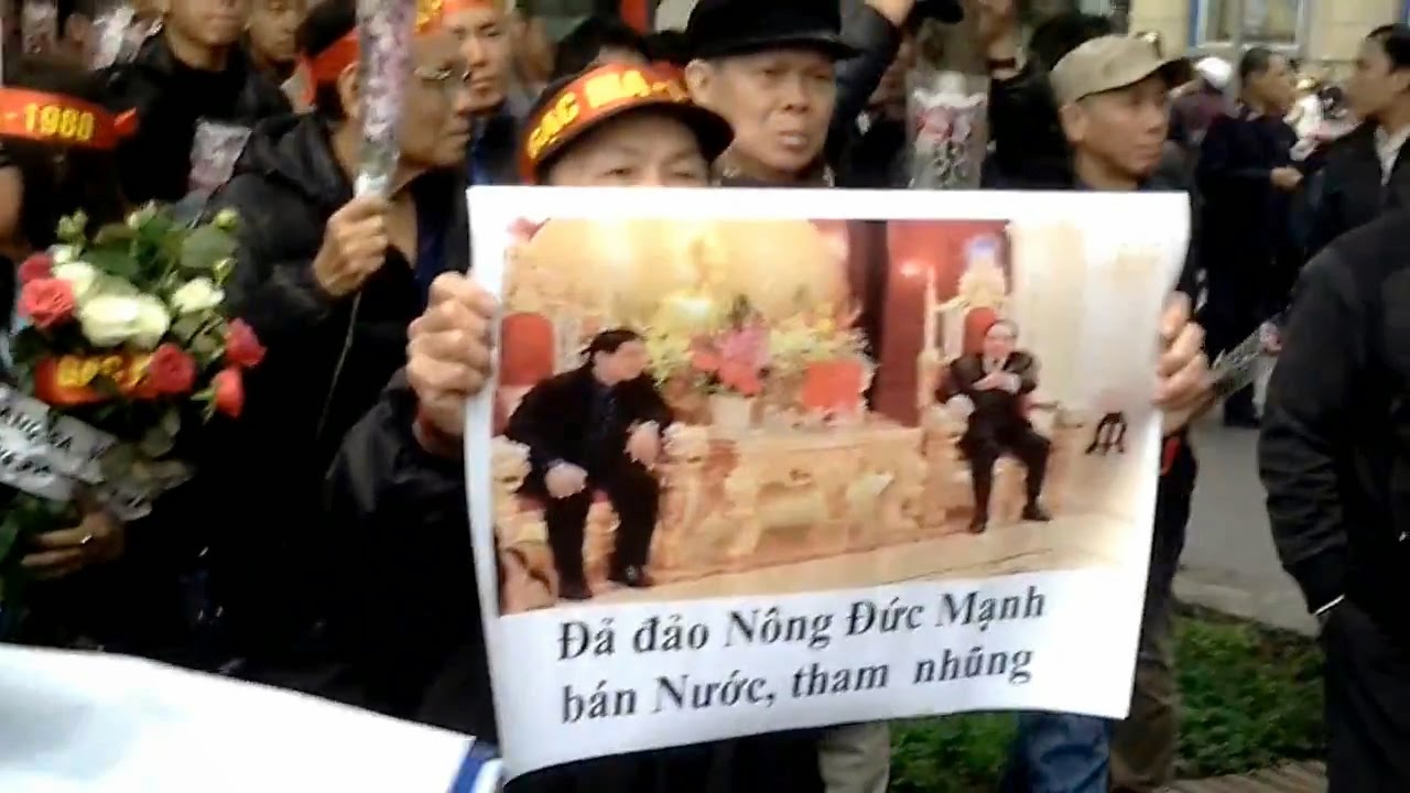 Phía dưới bức ảnh là một thông điệp mạnh mẽ ghi rõ: “Đả đảo Nông Đức Mạnh bán nước, tham nhũng”.