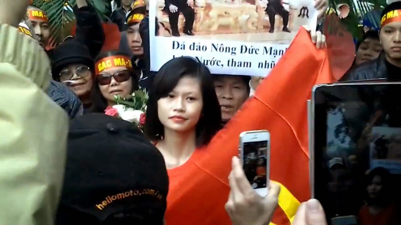 Như bị cham nọc, lực lượng tay say cộng sản liền điên tiết phản ứng. Vài giây sau đó, xuất hiện một cô gái trẻ mặc áo đỏ, với gương mặt sáng sủa chen lấn vào đám đông gây rối.