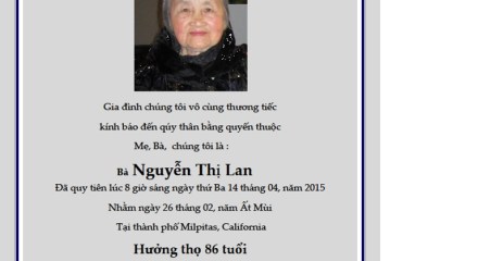 Tin Buồn, Được tin buồn Cụ Bà Nguyễn Thị Lan, mẹ chồng chị Khiêm, vừa qua đời vào ngày 14 tháng tư năm 2015 tại Milpitas, California. Thọ 86 tuổi. Chúng em, Hoà Đàm, Thanh Tân, xin cầu nguyện cho linh hồn Cụ Bà sớm siêu thoát về cõi Vĩnh hằng. Xin chia buồn cùng … Tiếp tục đọc