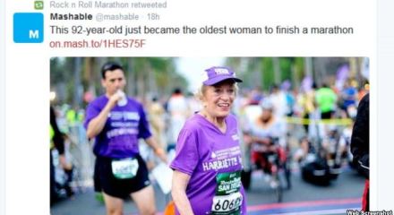 Phụ nữ 92 tuổi lập kỷ lục chạy marathon 42km Bà Harriette Thompson 92 tuổi về đích cuộc đua Rock ‘n’ Roll ở San Diego. (ảnh chụp từ trang Twitter của Rock ‘n’ Roll marathon) Một bệnh nhân chiến thắng ung thư 92 tuổi trở thành phụ nữ cao tuổi nhất hoàn tất một cuộc … Tiếp tục đọc