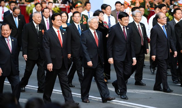 Các nhà lãnh đạo hàng đầu của đảng cộng sản Việt Nam. Từ phải hàng đầu Chủ tịch quốc hội Nguyễn Sinh Hùng, Chủ tịch nước Trương Tấn Sang, tổng bí thư Nguyễn Phú Trọng và thủ tướng Nguyễn Tấn Dũng đến tham dựdiễu hành kỷ niệm lần thứ 40 ngày 30 tháng 4 2015.