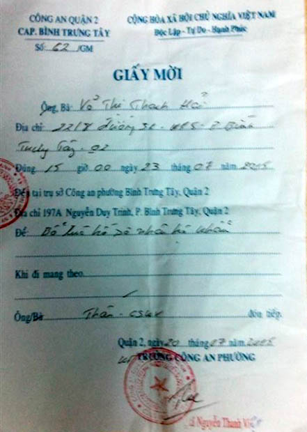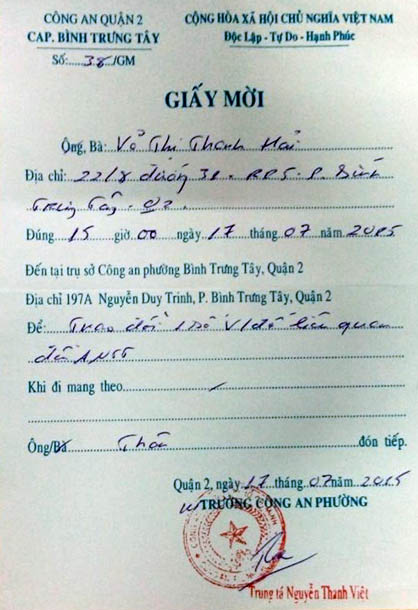 Khoảng hơn 14h30′ ngày 17.07 2015, công an hộ tịch tên là Thanh đưa “giấy mời” tôi đúng 15h cùng ngày đến trụ sở Công an phường Bình Trưng Tây, Q2 ở số 197A Nguyễn Duy Trinh để “trao đổi một số vấn đề về An ninh trật tự”. “Giấy mời” chỉ ghi cộc lốc người làm việc với tôi sẽ là “ông Thân”, không kèm theo họ tên đầy đủ hay cấp bậc, chức vụ của ông này.