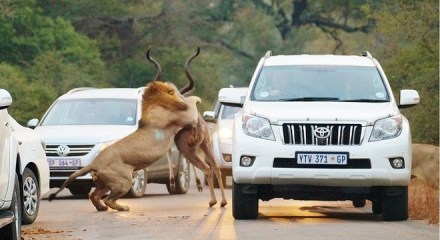 Hai con sư tử hạ gục linh dương vằn kudu và xé xác con mồi ngay trên con đường đầy xe ở vườn quốc gia Nam Phi, khiến du khách kinh ngạc.