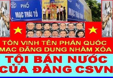 Mối đe dọa mất nước như gần kề khó tháo gỡ. Chính trong lúc ấy thì đảng CSVN lại muốn xây 58 tượng đài Hồ Chính Minh, một người Tầu hay một người Việt phản quốc bán đất biển. Chúng tôi nhớ lại việc con hát Cộng sản đã sang Tầu trước đền Mã Viện, đã đóng tuồng như nhạo báng Hai Bà Trưng. Một nhà Sư quốc doanh đã công kích LÝ THƯỜNG KIỆT « vô lễ » dám mang quân tấn công địch trên đất Tầu. Rồi ngày nay, đảng CSVN lại tôn vinh Mạc Đăng Dung, một kẻ không còn thể diện đem đất và dân dâng cho quan Tầu.