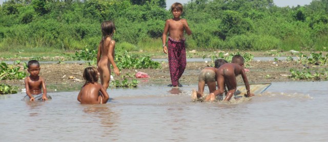 Mực nước ở Biển Hồ mà chúng tôi chứng kiến vào mùa khô vừa qua, nhiều nơi, không còn được nửa mét như hồi năm 2000 nữa. Có chỗ đã biến thành vũng cho trẻ con chơi đùa, hay hoá thành… sân chơi bóng chuyền rồi!