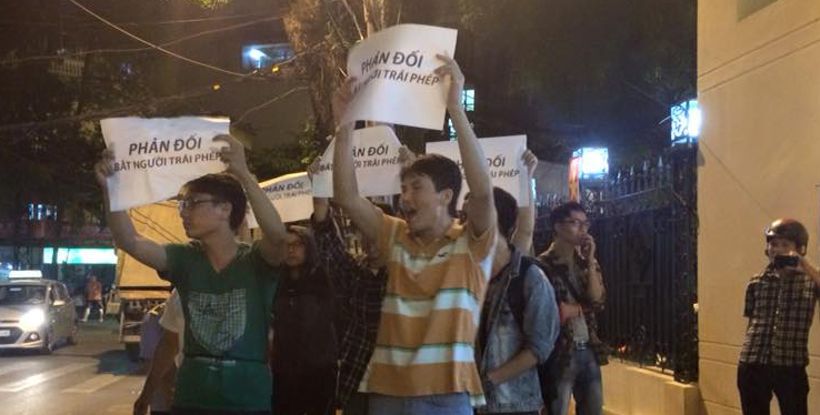 Lúc 21 giờ tối, khoảng 30 nhà hoạt động vẫn kiên trì đứng trước trụ sở CA quận Hai Bà Trưng hô vang khẩu hiệu “Yêu cầu thả người”.