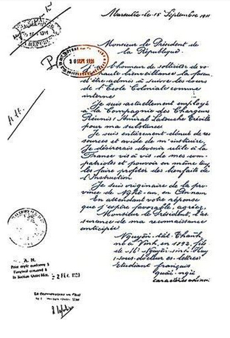 Chỉ hơn hai tháng sau, ngày 15-9-1911, tại Marseille, Nguyễn Tất Thành viết tay hai lá đơn bằng tiếng Pháp, cùng nội dung, chỉ khác tên người nhận; một gởi cho tổng thống Pháp và một gởi cho bộ trưởng bộ Thuộc địa Pháp, xin đặc ân để được vào học Trường Thuộc Địa Paris (École Coloniale de Paris). Sau đây là bản dịch lá đơn của Nguyễn Tất Thành: