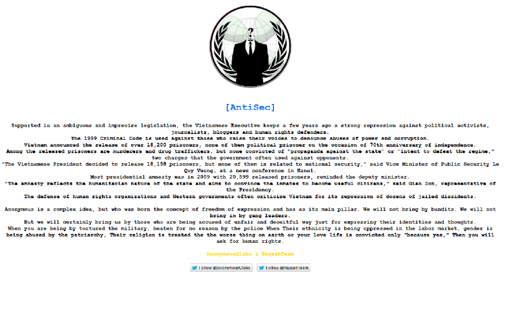 Dưới đây là toàn bộ nội thông điệp do 3 nhóm Anonymous, AntiSec và HagashTeam để lại sau khi tấn công các trang web thuộc sở hữu của chế độ CSVN: