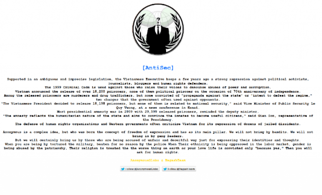 | Thông điệp do nhóm AntiSec để lại sau khi tấn công vào trang web của chế độ CSVN |
