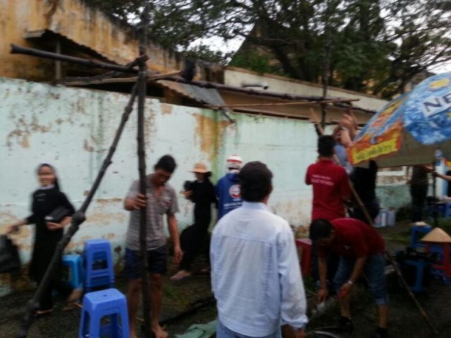 | Giáo dân dựng bạt che mưa, che gió cho các nữ tu thức qua đêm bảo vệ tài sản. |