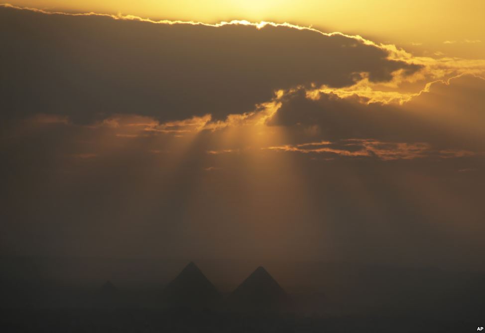 Mặt trời ẩn sau những đám mây bên trên địa điểm lịch sử Kim tự tháp Giza nằm ngay bên ngoài Cairo, Ai Cập.