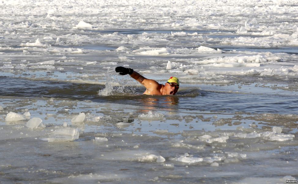 Một người đàn ông bơi trong nước lạnh giá của sông Amur, ở Hắc Hà, tỉnh Hắc Long Giang, Trung Quốc, ngày 1 tháng 11, 2015.