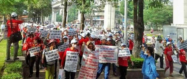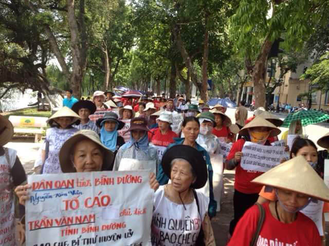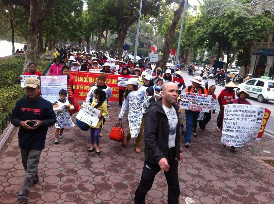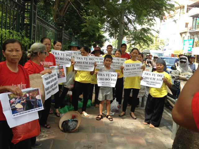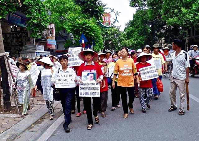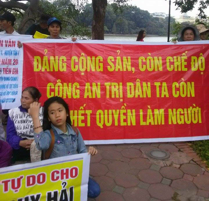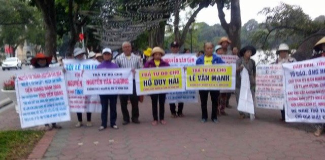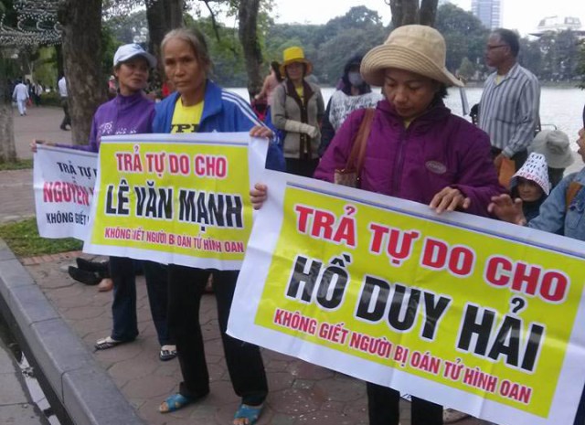 Trần Quang Thành (Danlambao) – Sáng nay ngày 3/12/2015, nhiều dân oan 3 miền Bắc-Trung-Nam đã tổ chức cuộc diễn hành tại tượng đài Lý Thái Tổ và quanh hồ Hoàn Kiếm đòi công lý. Bà con đã giương cao các biểu ngữ đòi nhà cầm quyền CSVN hủy bỏ bản án oan sai với các tử tù Nguyễn Văn Chưởng, Lê Văn Mạnh, Hồ Duy Hải và hô vang những khẩu hiệu Tự do cho Nguyễn Văn Chưởng, Tự do cho Lê Văn Mạnh, Tự do cho Hồ Duy Hải.