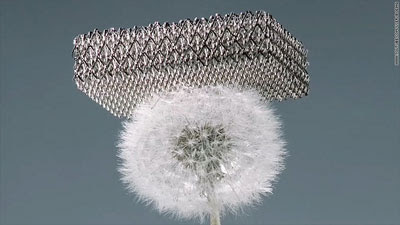Một hình ảnh do Boeing công bố cho thấy một khối lượng hợp kim Microlattice bay bỗng rất nhẹ nằm trên một cái hoa tơ trời mà không làm những sợi tơ của hoa bị tổn hại.