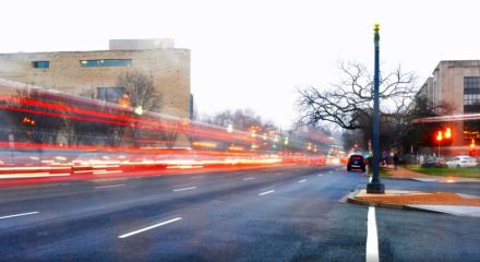 Vệt sáng từ đèn xe trong một bức hình chụp bằng kỹ thuật phơi sáng lâu trong một buổi chiều mưa bên ngoài tòa nhà VOA trên Đại lộ Independence SW ở thủ đô Washington, ngày 30 tháng 12, 2015 (Ảnh: Dia Bekheet)