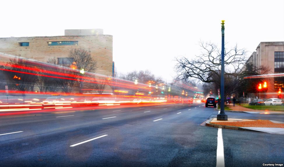 Vệt sáng từ đèn xe trong một bức hình chụp bằng kỹ thuật phơi sáng lâu trong một buổi chiều mưa bên ngoài tòa nhà VOA trên Đại lộ Independence SW ở thủ đô Washington, ngày 30 tháng 12, 2015 (Ảnh: Dia Bekheet)