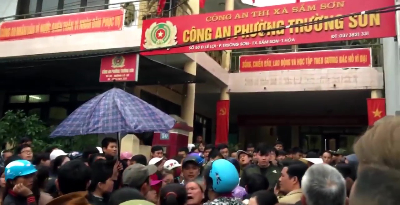Ngay sau đó, hàng trăm người dân địa phương đã kéo đến trụ sở CA phường Trường Sơn (thị xã Sầm Sơn, Thanh Hoá) để biểu tình phản đối.