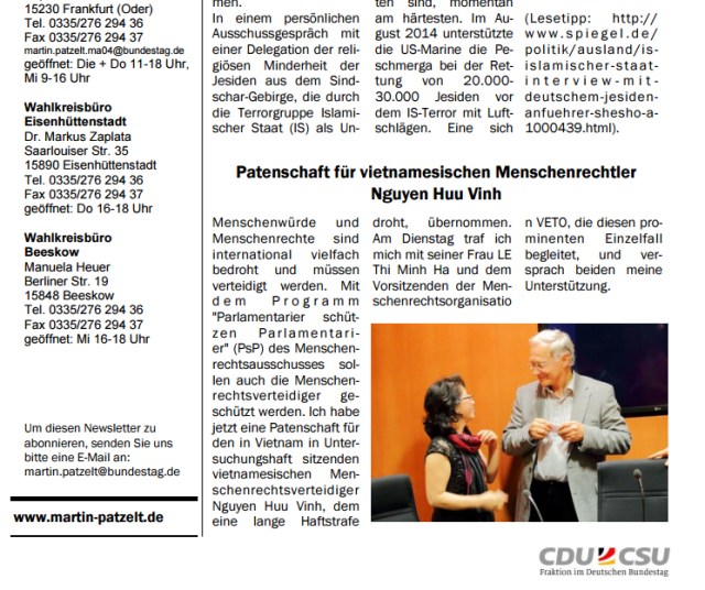 Hình chụp chung với bà Lê Thị Minh Hà trên Bản tin hàng tuần của dân biểu Martin Patzelt (trang 4), ra ngày 7.11.2014 (tiếng Đức):