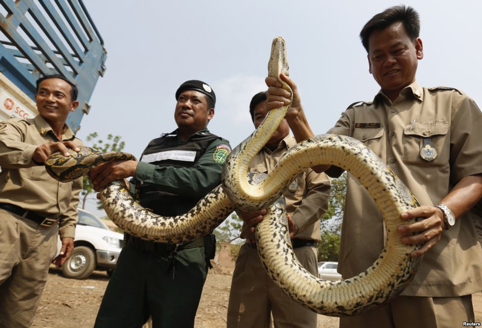 Cảnh sát Campuchia cầm một con trăn trước khi trao cho những thành viên của tổ chức phi chính phủ WildAid, sau khi nó được tịch thu từ những tay buôn lậu, ở tỉnh Kandal, ngoại ô Phnom Penh.