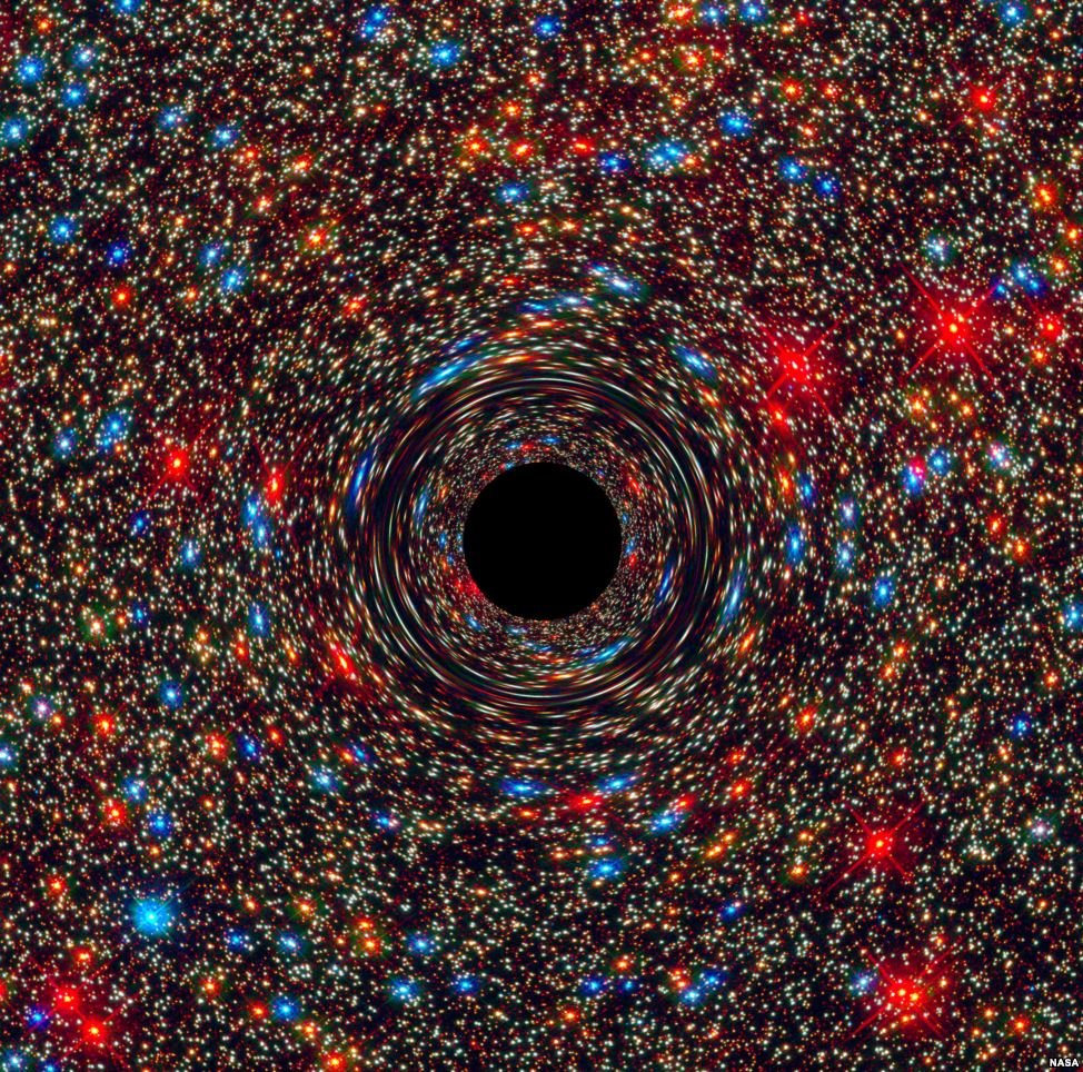 Hình ảnh do máy tính mô phỏng cho thấy một lỗ đen siêu lớn ở trung tâm của một thiên hà. Khu vực màu đen ở trung tâm là chân trời của sự kiện lỗ đen, nơi mà không ánh sáng nào có thể thoát khỏi sức níu kéo trọng lực của vật thể khổng lồ này. Ánh sáng từ những ngôi sao trên nền bay quanh hố đen. (Credits: ESA, and D. Coe, J. Anderson, and R. van der Marel (STScI)