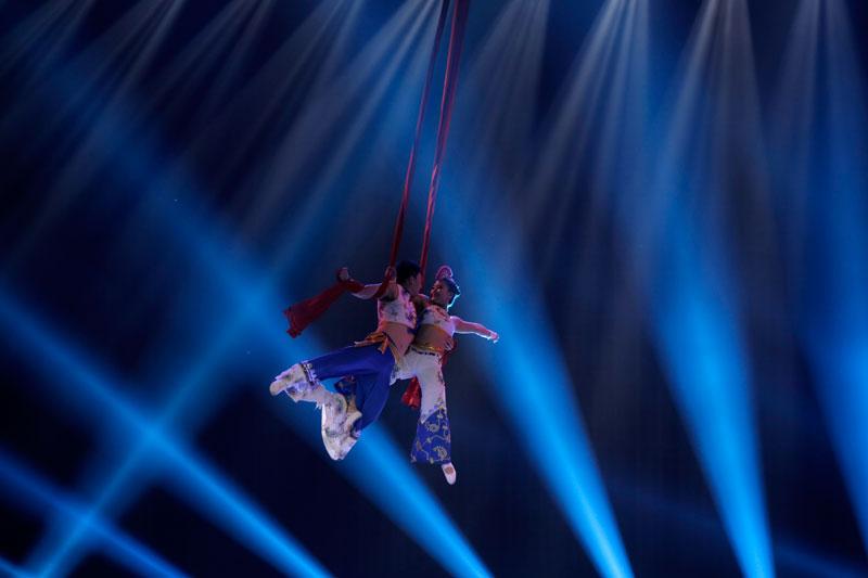 Hai diễn viên tỉnh Vân Nam biểu diễn một màn xiệc tại Spring Festival Gala ở Phnom Penh. (Siv Channa/The Cambodia Daily)