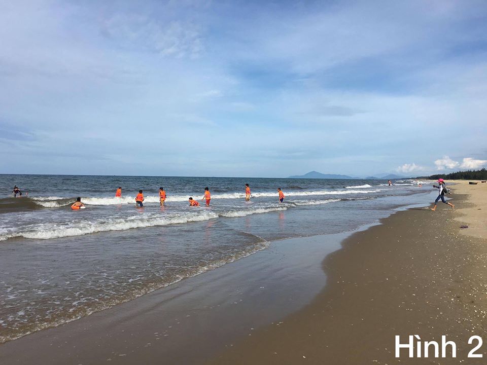 Liền sau đó tôi thấy một nhóm trẻ em mặc áo phao chạy xuống biển (hình 1 và hình 2). Quá bất ngờ, vì không nghĩ là có ai dám cho trẻ em xuống đây tắm vào thời điểm này. Hơn nữa nhiều bài phóng sự quốc tế khẳng định trẻ em đã không dám xuống biển Hà Tĩnh. Vội vàng, tôi đến hỏi người trông trẻ ở đây thì được trả lời rằng: “Hiện chính quyền chưa công bố nguyên nhân cá chết, chưa trả lời vì sao cá chết thì cứ ra đây tắm bình thường, trẻ em cần nơi vui chơi mà. Khi nào có xác định nguyên nhân chính xác thì mới biết được!”. “Phó chủ tịch tỉnh còn nói dân yên tâm ăn cá, tắm biển ở Vũng Áng mà, huống gì ở đây cách Vũng Áng hơn 60 cây số!”