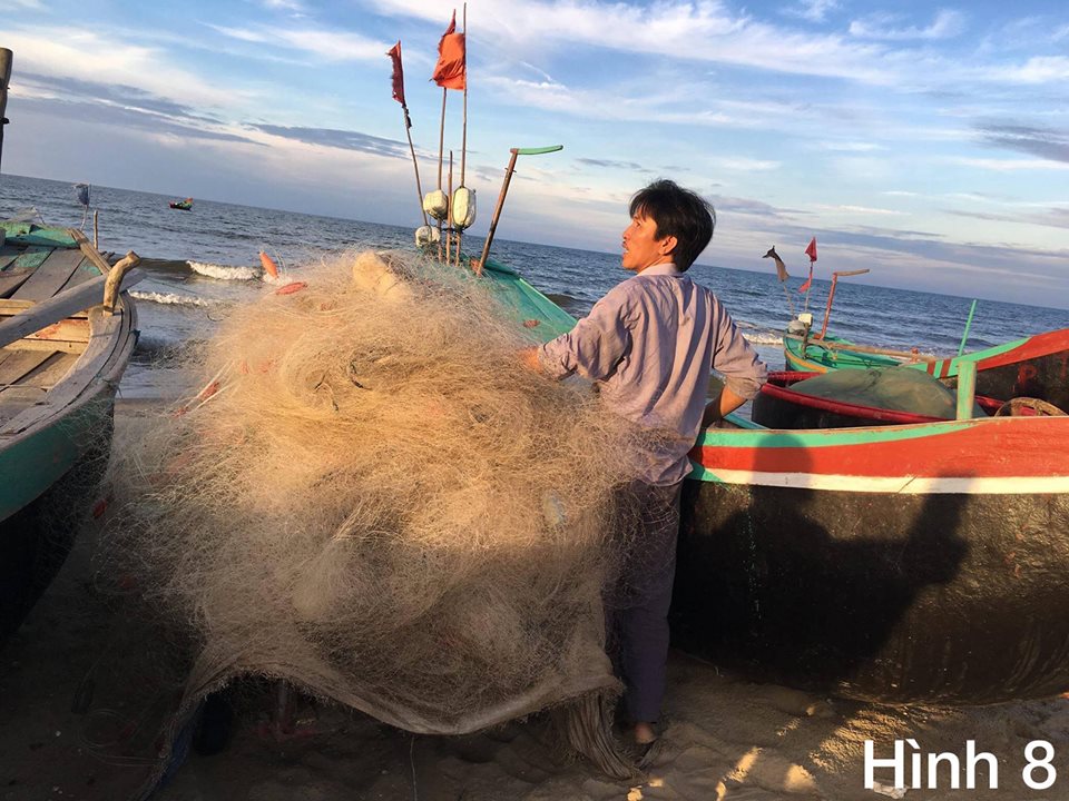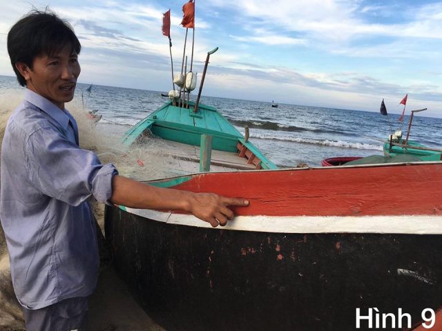 Chi phí đóng thuyền là 50 triệu, lưới chất ba là 20 triệu/vàng, mỗi thuyền 5 vàng (hình 8). Vậy là 150 triệu tâm huyết đang phơi sương phơi nắng! (Trong hình 9: anh Chiến đang chỉ vào vết nứt do thuyền bị phơi nắng suốt 3 tháng nay.) Cần câu kiếm cơm mà ai dám bỏ? Bỏ rồi cơm ăn với gì?