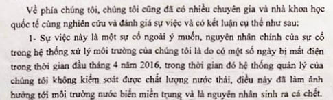 Ngày 18.06.2016 Chủ tịch Hội đồng Quản trị của Formosa gửi một công văn cho Thủ tướng Nguyễn Xuân Phúc. Trong công văn này có lời giải thích lý do dẫn đến chất thải độc hại ra biển là vì bị mất điện trong thời gian đầu tháng 4, 2016 và hệ thống quản lý không kiểm soát được nước thải.