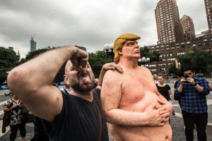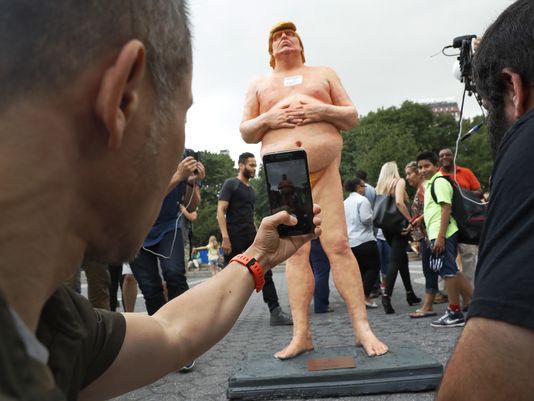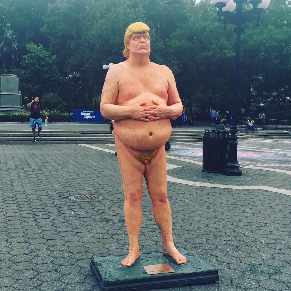Tại New York ở khu sầm uất nhất giữa quãng trường Đoàn Kết “Union Square” của Manhattan, không xa cao ốc Trump Tower là bao nhiêu; tượng khỏa thân Donald Trump đứng trên bệ đã được dân New York chào đón đứng sát bên chụp hình tự sướng và chắc rằng họ sẽ không quên.