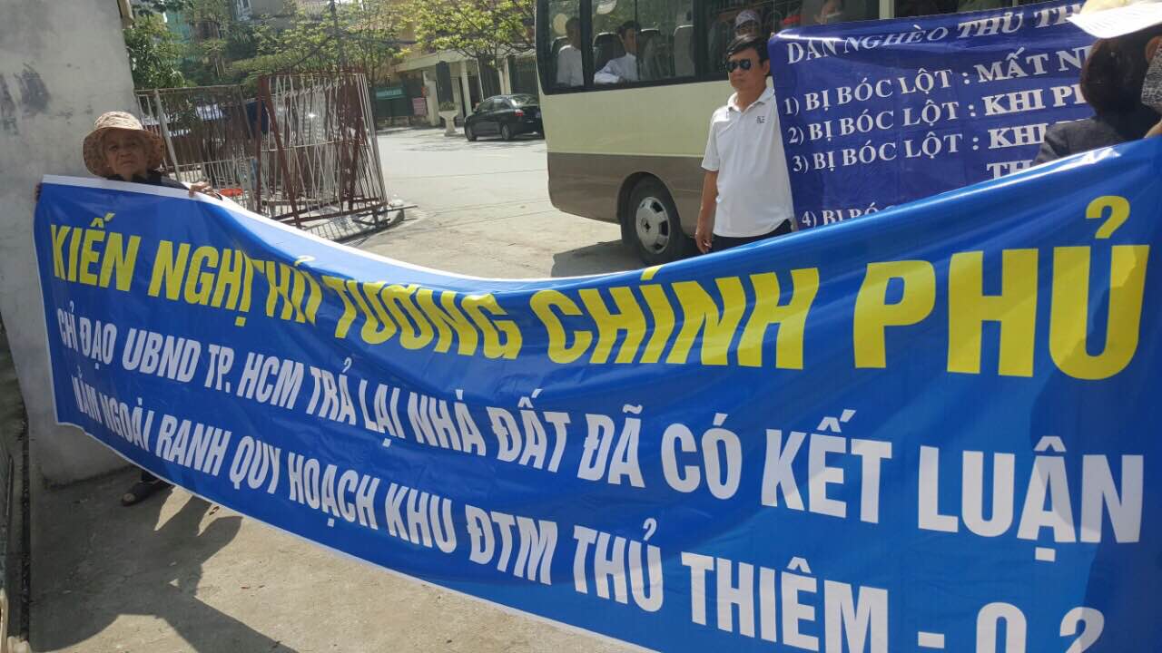 Nhóm 63 hộ dân thuộc dự án Khu đô thị mới Thủ Thiêm quận 2 thành phố Hồ Chí Minh, đã tập trung tại Hà Nội từ ngày 24/10/2016. Chưa được Ban tiếp dân TW đảng và nhà nước tại số 1 Ngô Thời Nhậm, Hà Đông giải quyết đúng theo pháp luật, nên sáng ngày Thứ Năm ngày 27/10/2016 đã tập trung tại văn phòng chính phủ, Thủ Tướng và quốc hội để tố cáo việc cố tình làm trái pháp luật, cố tình chà đạp luật pháp, không chấp hành nghị quyết của đảng, tức là chống đối đảng, để ăn cướp nhà đất và tài sản của dân nghèo đem chia cho nhau để kinh doanh, kiếm lời trên mồ hôi nước mắt và sương máu của nhân dân. Nhưng không bị bất cứ cấp nào xem xét, giải quyết.