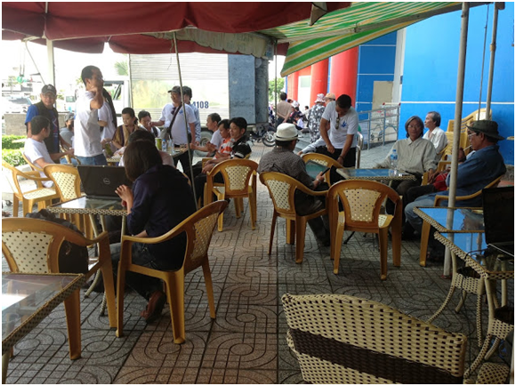 Nó đang nghỉ trưa ngoài tòa án ngồi gần người áo xanh đội mũ đang hút thuốc.