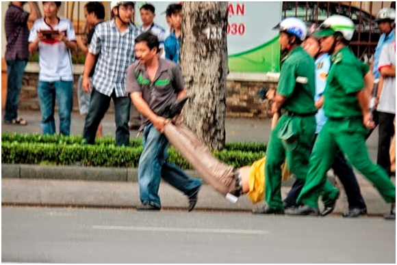 Rồi cuối cùng tôi cũng đoán được tại sao công an bắt và khiêng bạn tôi như con vật giữa ban ngày như thế. Bởi vì bạn tôi đã xông vào cứu một người biểu tình không quen biết bị côn an đánh.