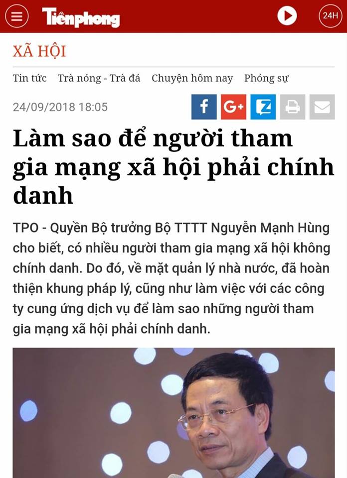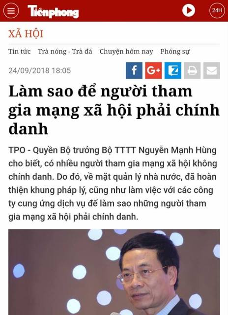 Vài tuần sau, vào ngày 24 tháng 9 năm 2018, Quyền Bộ Trưởng Bộ TTTT Nguyễn Mạnh Hùng “tố” tiếp: “Nhiều người tham gia mạng xã hội không chính danh. Do đó, về mặt quản lý nhà nước, đã hoàn thiện khung pháp lý, cũng như làm việc với các công ty cung ứng dịch vụ để làm sao những người tham gia mạng xã hội phải chính danh.”
