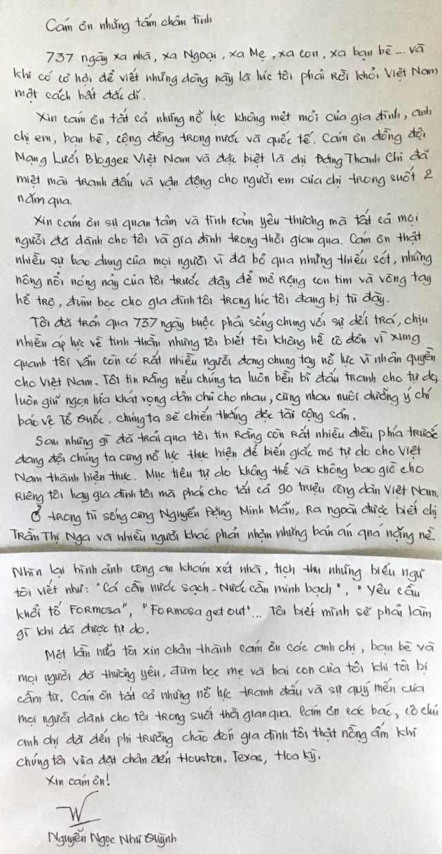 Một lần nữa tôi xin chân thành cám ơn các anh chị, bạn bè và mọi người đã thương yêu đùm bọc mẹ và hai con của tôi khi tôi bị cầm tù. Cám ơn tất cả những nỗ lực tranh đấu và sự quý mến của mọi người dành cho tôi trong suốt thời gian qua. Cám ơn các bác, cô chú, anh chị đã đến phi trường chào đón gia đình tôi thật nồng ấm khi chúng tôi vừa đặt chân đến Houston, Texas, Hoa Kỳ.