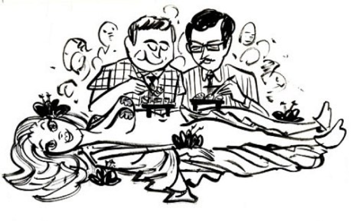 Thực khách cầm đĩa ăn đi chung quanh nàng, phân vân: “Ta nên gắp món nào? Gắp ở đâu trước? Ở ngực hay ở bụng? Ta có nên nhìn vào mắt nàng khi ta gắp hay chỉ nhìn vào miếng sushi?”