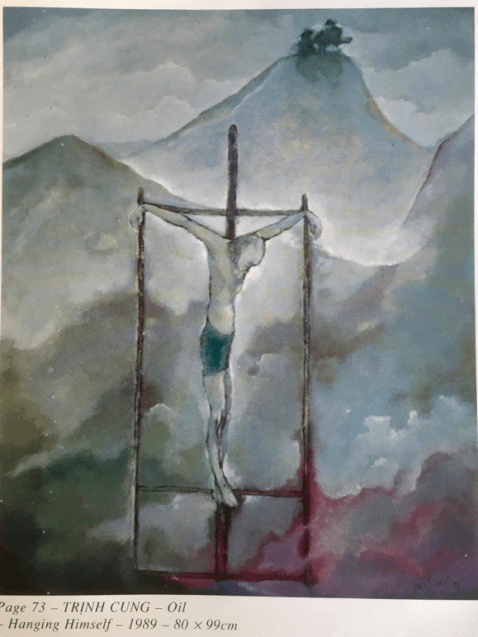 | Tranh “Treo Trên Giá Vẽ”, sơn dầu trên canvas. 80 x100cm. Trịnh Cung vẽ tại Sài Gòn 1989. Hà Thúc Cần sưu tập. |