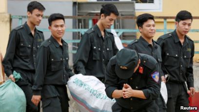 | Một cảnh sát viên lạy tạ dân làng Đồng Tâm sau khi được phóng thích ngày 22 tháng Tư, 2017 |