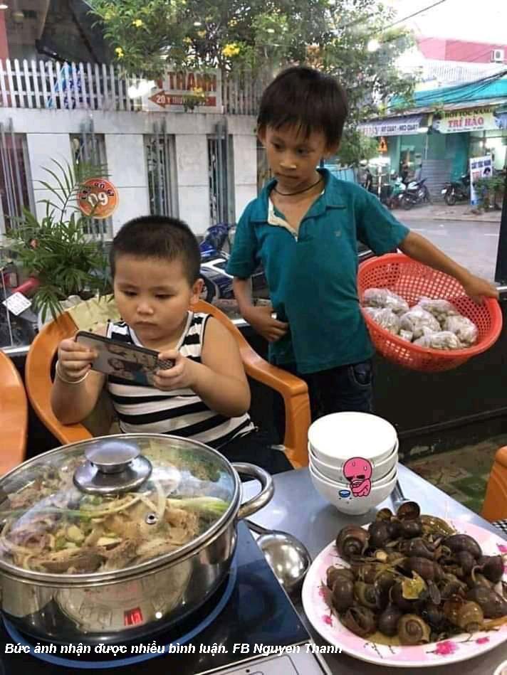 Em bé đứng bán hàng rong bưng rổ