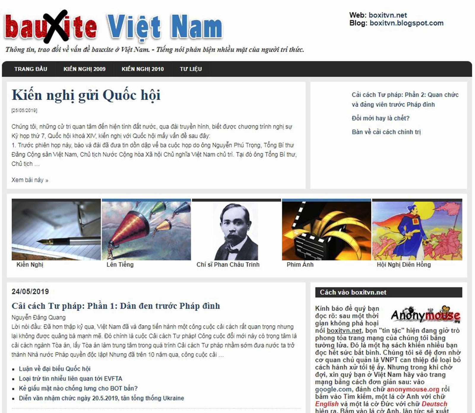 | Trang mạng Bô Xít Việt Nam (www.boxitvn.net) do các nhà trí thức Việt Nam chủ trương đã sống được 10 năm dù dù bị chính quyền Cộng Sản Việt Nam và Trung Quốc tấn công. |