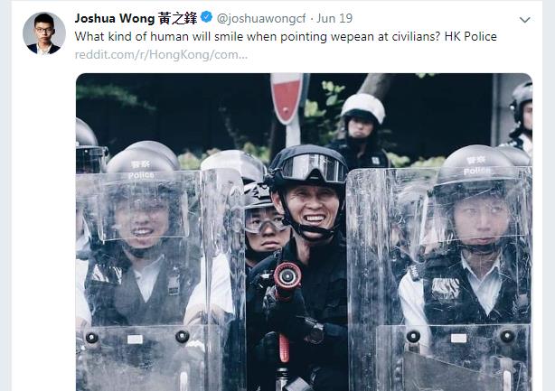 Trong một tweet của Hoàng Chí Phong gần đây, anh gửi lên một tấm ảnh về lực lượng trấn áp mặc áo đen, có chỉ dấu riêng. Đây là lực lượng bị nhiều người Hồng Kông thắc mắc vì đó là những người đánh đập người biểu tình tháng 6 năm 2019, hết sức tàn bạo. Đánh đến mức mà cảnh sát áo xanh quen thuộc của Hồng Kông phải chạy đến can.