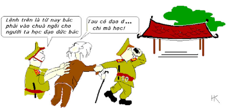 Mười sáu thương Bác đã có công với Cắt Mạng rước chủ thuyết CS vô thần về nước, và đã triệt để áp dụng, đặc biệt là trên Miền Bắc, quân bác đã phá sạch đình miếu chùa chiền, biến nơi thờ phượng thành nhà kho nhà chứa, vậy mà nay Bác bị các đồng chí bắt vào chùa ngồi hít khói lại bị Phật đá đít ngày đêm; oan Bác bị bắt vào chùa còn to gấp tỷ lần oan Thị Kính.