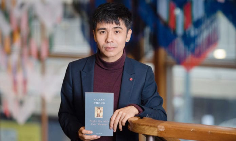 | Ocean Vương và quyển “Night Sky with Exit Wounds” của anh. (Hình: kundiman.org) |