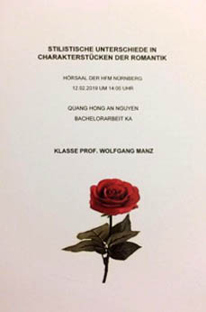 Như vậy thi tốt nghiệp Cử nhân âm nhạc ở Đúc gồm hai phần riêng biệt. Một là tốt nghiệp chuyên môn như của tôi là piano cổ điển trình diễn cùng với luận án. Hai là phần lý thuyết như phân tích tác phẩm, sáng tác…