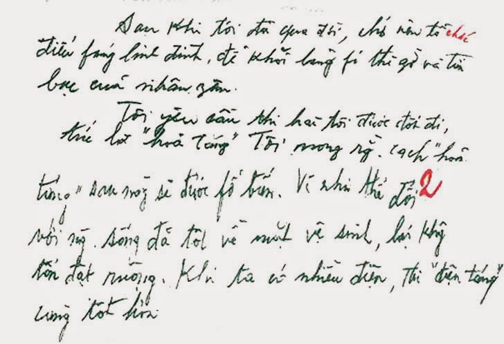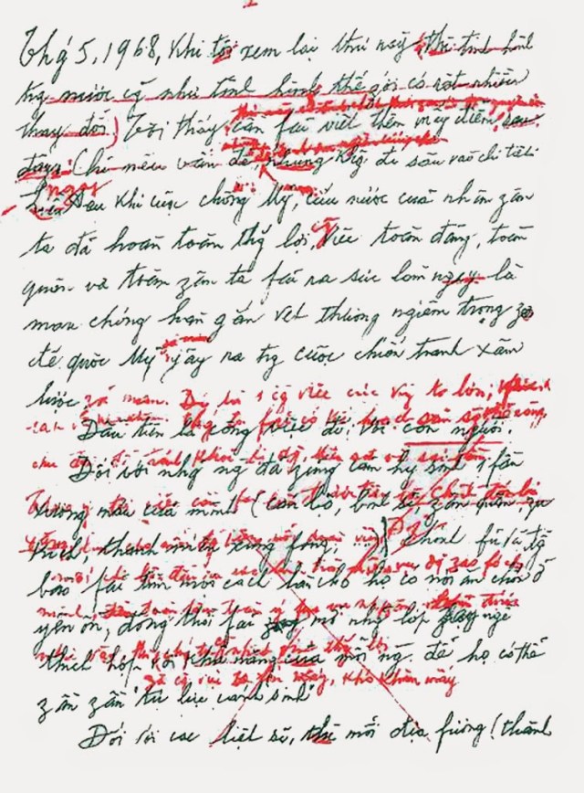 Bác làm gì vậy Bác!? Chi mà sửa tèm lem tẹp nhẹp máu me tùm lum vậy Bác!? Có vài trang giấy mà Bác phải 4 năm tình lận đận đến đổ máu vậy thì bố ai tin Bác là người viết Bản án chế độ thực dân Pháp ký tên Nguyễn Ái Quốc!