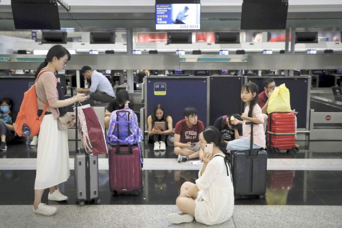 | Du khách vật vạ tại phi trường Hồng Kông hôm Thứ Hai, 12 Tháng Tám. (Hình: AP Photo/Kin Cheung) |