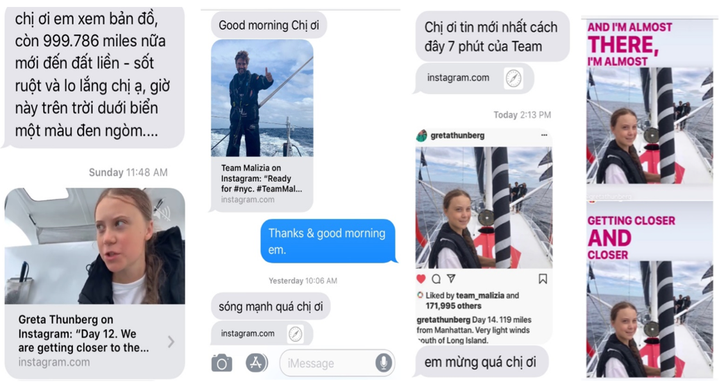 Sáng ngày thứ Hai 27 tháng 8, mới 7 giờ sáng, cô em đã text “Good morning chị ơi,” kèm cho một cái link Instagram của Team Malizia: “Ready for #nyc.” Rồi 3 tiếng sau, cô em lại text: “Sóng mạnh quá chị ơi,” kèm theo cái link Instagram của Greta: “Ngày 13. Biển động phía nam Nova Scotia. Nhưng thời tiết cho biết gần Nữu Ước gió sẽ giảm so với tiên đoán và tin thời tiết cho biết Thứ Tư thuyền tới nơi – Chúng tôi sẽ gửi tin khi gần tới bờ – Day 13. Rough seas south of Nova Scotia. But conditions closer to New York will be slower than predicted and weather update suggests Wednesday arrival – an updated ETA will come as we near the coast.”