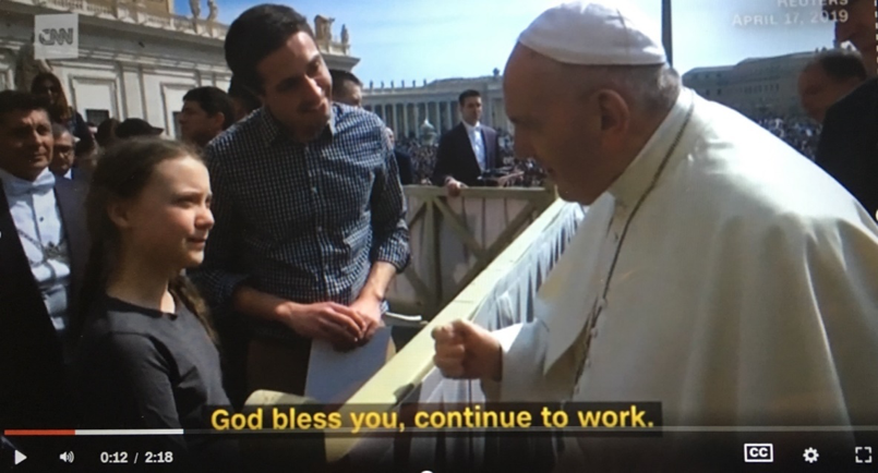 Tin CNN sáng ngày 28 tháng 8: “Greta Thunberg đã tới Nữu Ước sau cuộc hải hành 15 ngày bằng thuyền.” Bản tin kèm theo một đoạn phim ngắn 2 phút 18 giây song cô đọng về hành trình đòi các chính phủ trên thế giới giải quyết nạn khí hậu biến đổi đang đe dọa tới sự diệt vong của nhân loại, mở đầu bằng cuộc tiếp kiến của cô Greta với Đức Giáo Hoàng Francis vào tháng Tư vừa qua.