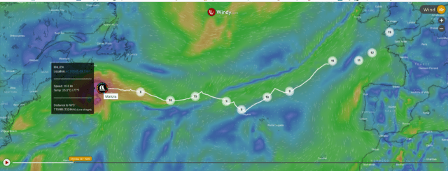 | Cuộc hải hành 15 ngày của nhà hoạt đông cho môi trường Greta Thunberg, 16 tuổi, từ Plymouth, Anh Quốc (góc trên, bên phải) tới New York trên chiếc thuyền đua Malizia II trang bị một hệ thống thu năng lượng mặt trời. Trong khung mầu đen là các chi tiết tọa độ, tốc độ gió, nhiệt độ, khoảng cách từ thuyền tới điểm đến là cảng New York, ghi vào lúc 10 giờ sáng ngày thứ Hai 26 tháng 8, 2019. (Screenshot từ Web site tracker.borisherrmannracing.com/) |