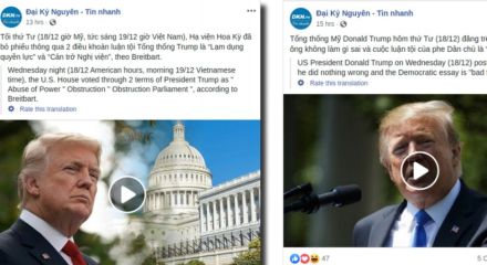 Facebook gỡ hàng loạt tài khoản giả ‘chống cộng, phò Trump’ của Đại Kỷ Nguyên 5 giờ trước Chia sẻ trên Facebook Chia sẻ trên Messenger Chia sẻ trên Twitter Chia sẻ trên Email Chia sẻ Bản quyền hình ảnhFACEBOOKImage captionẢnh chụp màn hình thông tin trên trang Đại Kỷ Nguyên trong nghiên cứu cửu … Tiếp tục đọc